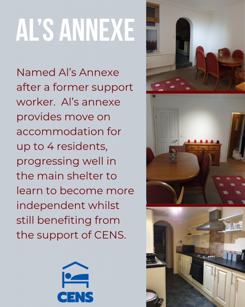 As well as our main 16-bed night shelter, CENS has purchased two move-on properties. They have been fully refurbished to provide our residents with more independent living opportunities whilst still benefiting from CENS wrap-around service. It has proven to be a huge success in helping break the survival mode cycle of homelessness and create a more stable future.